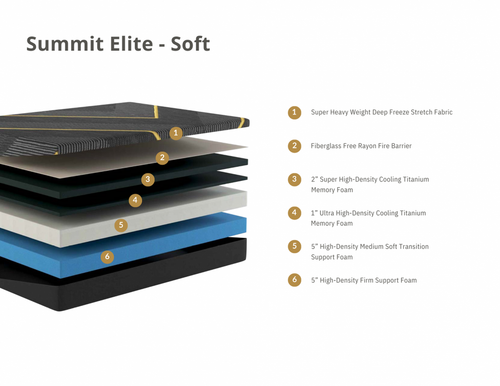 The Summit Elite is available in Soft, Medium, Firm, and Luxury Firm comfort options so you can select the exact feel that matches your body and sleeping style.